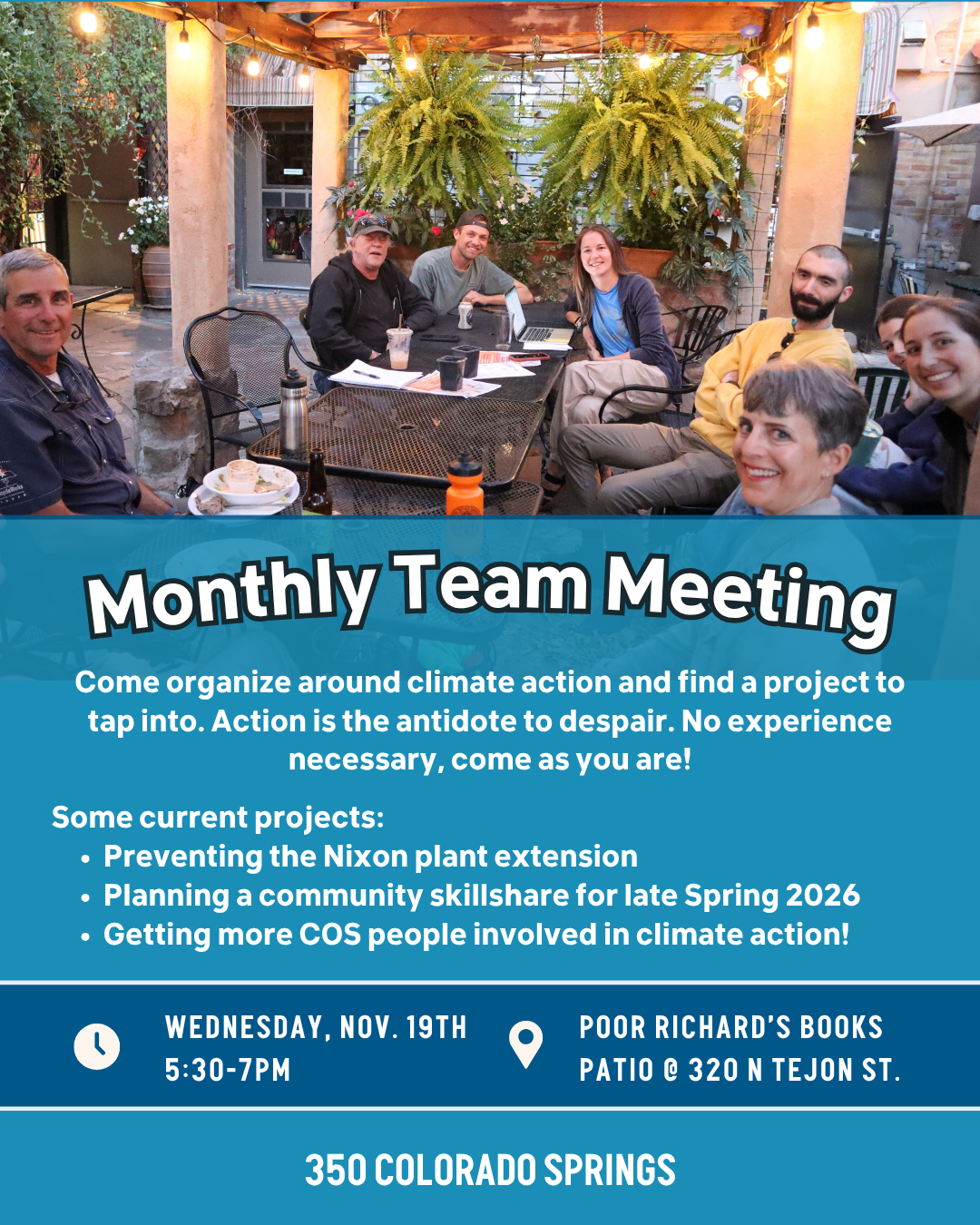 Join the monthly 350 Colorado Springs Team Meeting! Welcome to everyone! Connect with other organizers, support local campaigns and actions, skill-build, and help make sure that Colorado Springs is a robust part of the statewide climate movement.