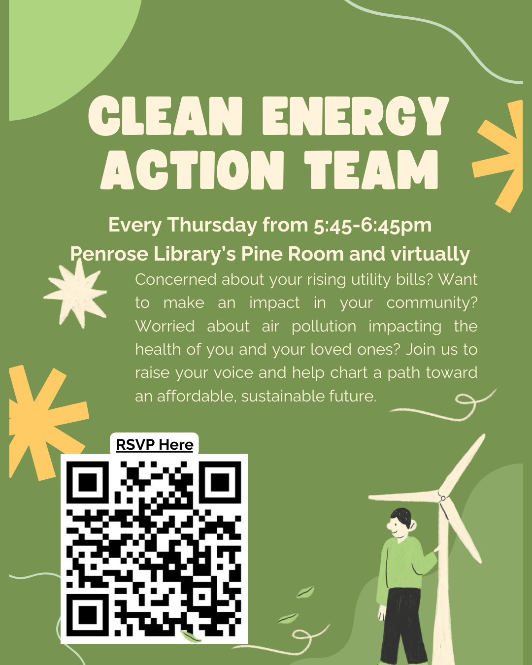 Concerned about your rising utility bills? Want to make an impact in your community? Worried about air pollution impacting the health of you and your loved ones? Join us to raise your voice and help chart a path toward an affordable, sustainable future. Meeting is in the Penrose Library Pine […]