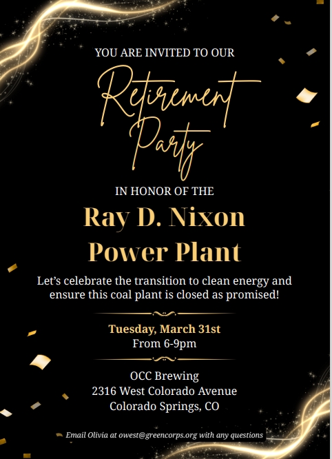 You're Invited - Nixon Power Plant's Retirement Party Join us to celebrate the transition to clean energy and to ensure the retirement of the Nixon Power Plant! Colorado Springs Utilities committed to retiring this coal plant by the end of 2029, so let's show them just how many of us […] |