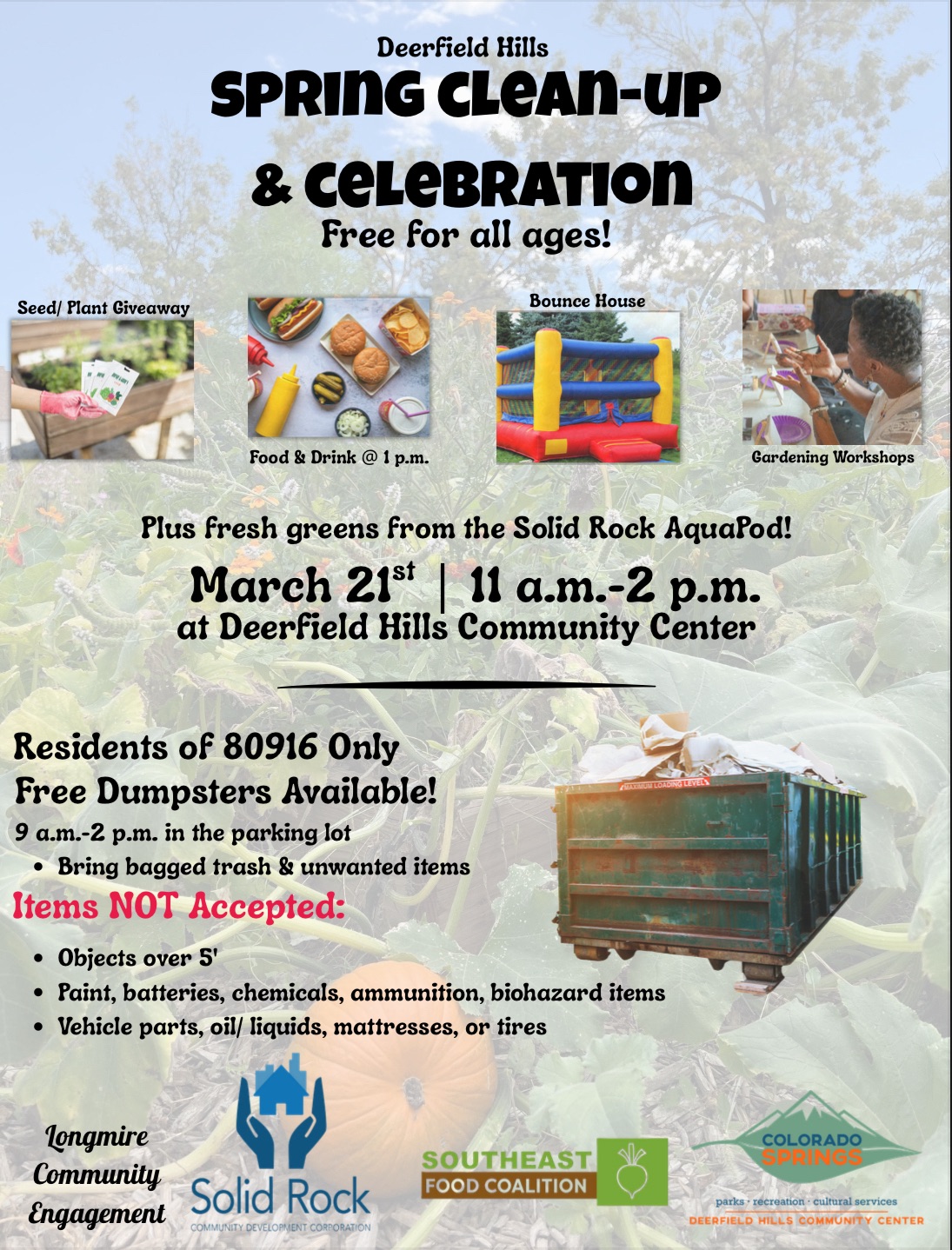 Deerfield Hills Spring Clean Up and Celebration at Deerfield Hills Community Center, 4290 Deerfield Hills Road, 80916. Saturday, March 21 from 11-2 pm. Bounce house, garden workshops, seed/plant give away. Free and open to all ages! Free dumpster available for 80916 residents (proof of residency required) from 9 am-2 pm. […]