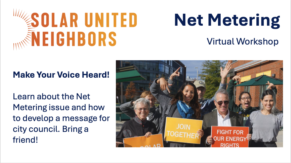 ![]() Use the link below to sign up now for the virtual event described on the Solar United Neighbors event registration page: Are you frustrated by Colorado Springs Utilities’ (CSU) proposal to end Net Metering? Join Solar United Neighbors on Thursday, September 25 at 6pm to send a message to city […] |