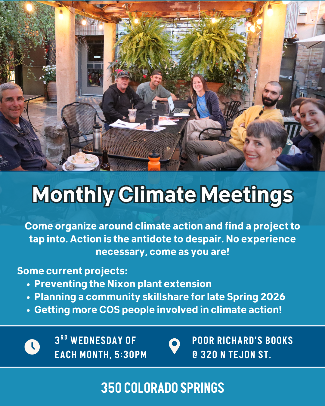 Join us for our regular 350 Colorado Springs team meeting: A space for collaboration and collective action to address the times we're living in at the grassroots level. One of our main campaigns currently is to retire the Nixon coal plant on schedule and build a healthy, just energy future […]