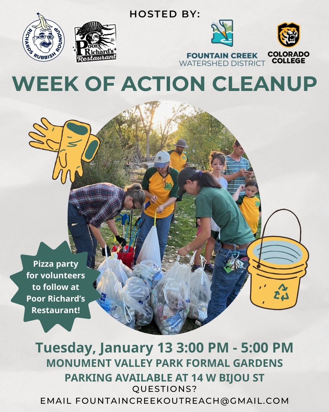 Parking will be at the Gospel Mission, then walk to the side of the church for the cleanup. After the cleanup, join us for pizza and drinks at Poor Richards! See the website to RSVP. |