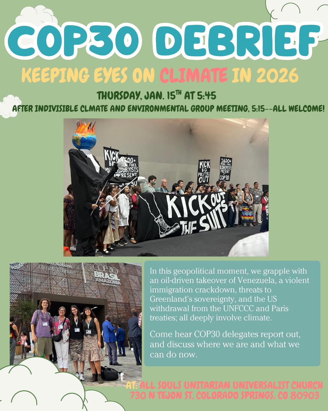 Check out the Indivisible Environmental Action Team's monthly meeting with a guest presentation by the Colorado College delegation on their visit to COP30 in Brazil and several other ongoing environmental initiatives and climate advocates.