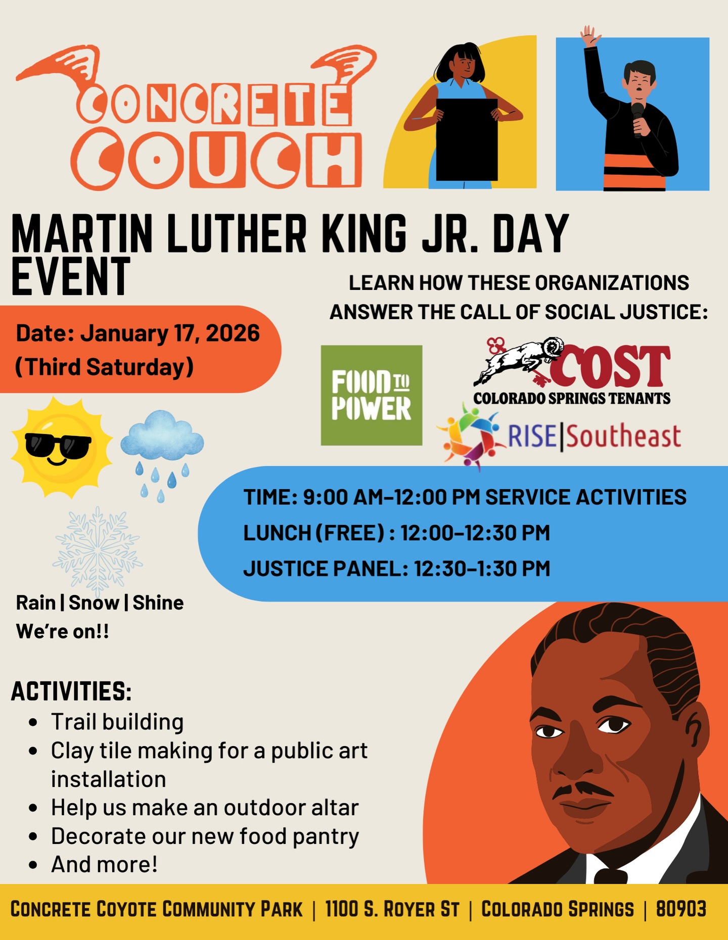 Trail making Clay tile making for a public art installation Help us make an outdoor altar Decorate our new food pantry And more! Learn how these orgs answer the call of social justice: Food to Power COST: Colorado Springs Tenants RISE Southeast There will also be lunch (free)!